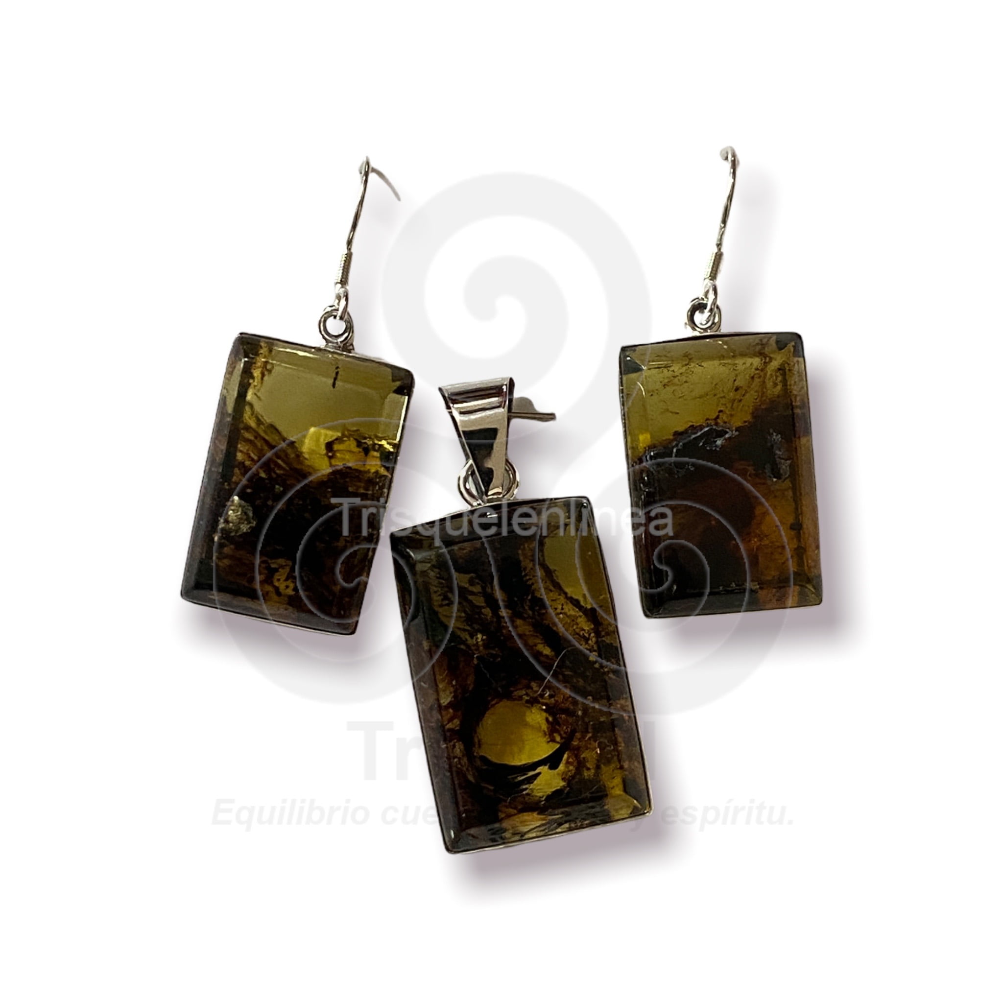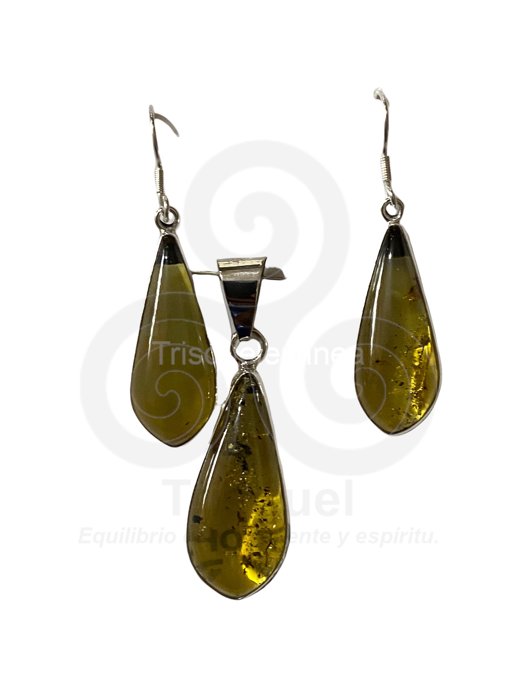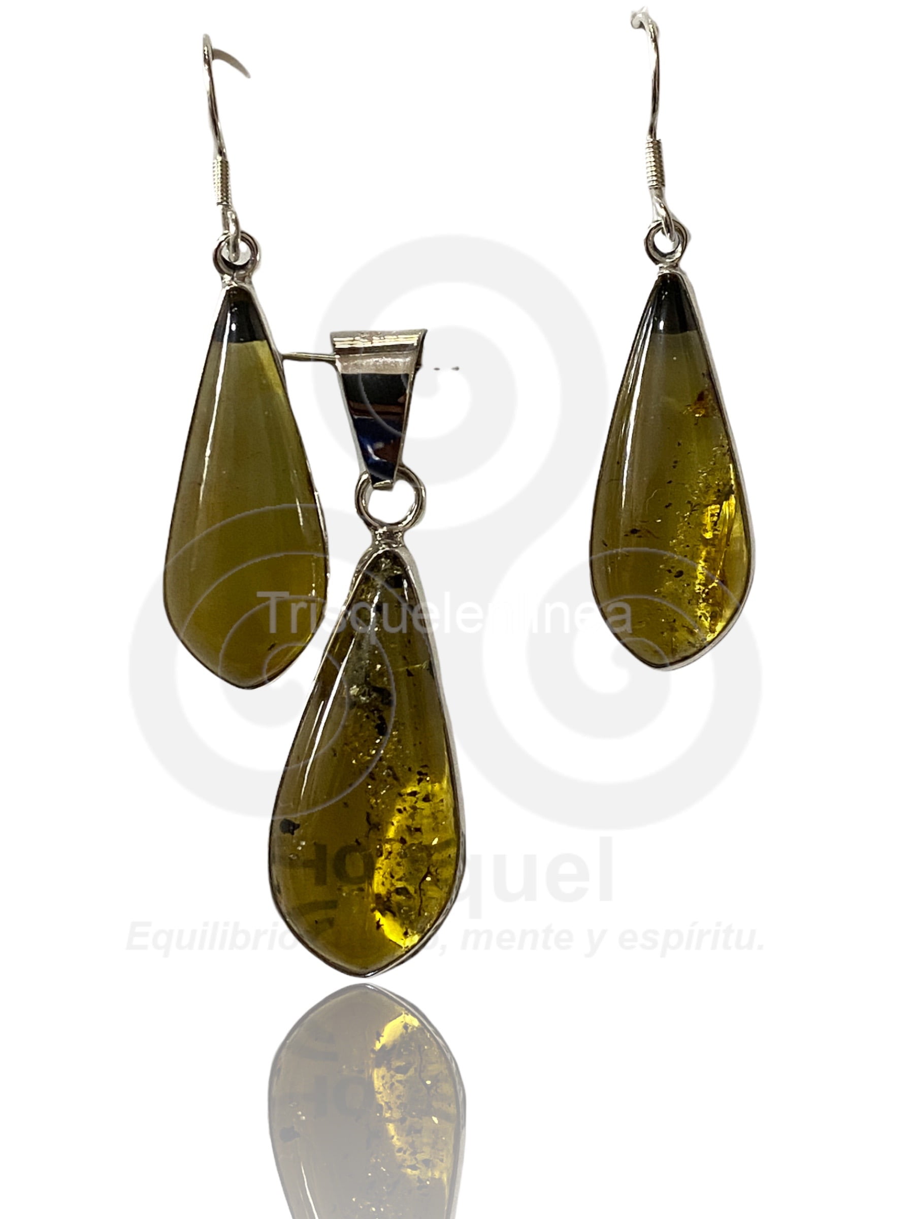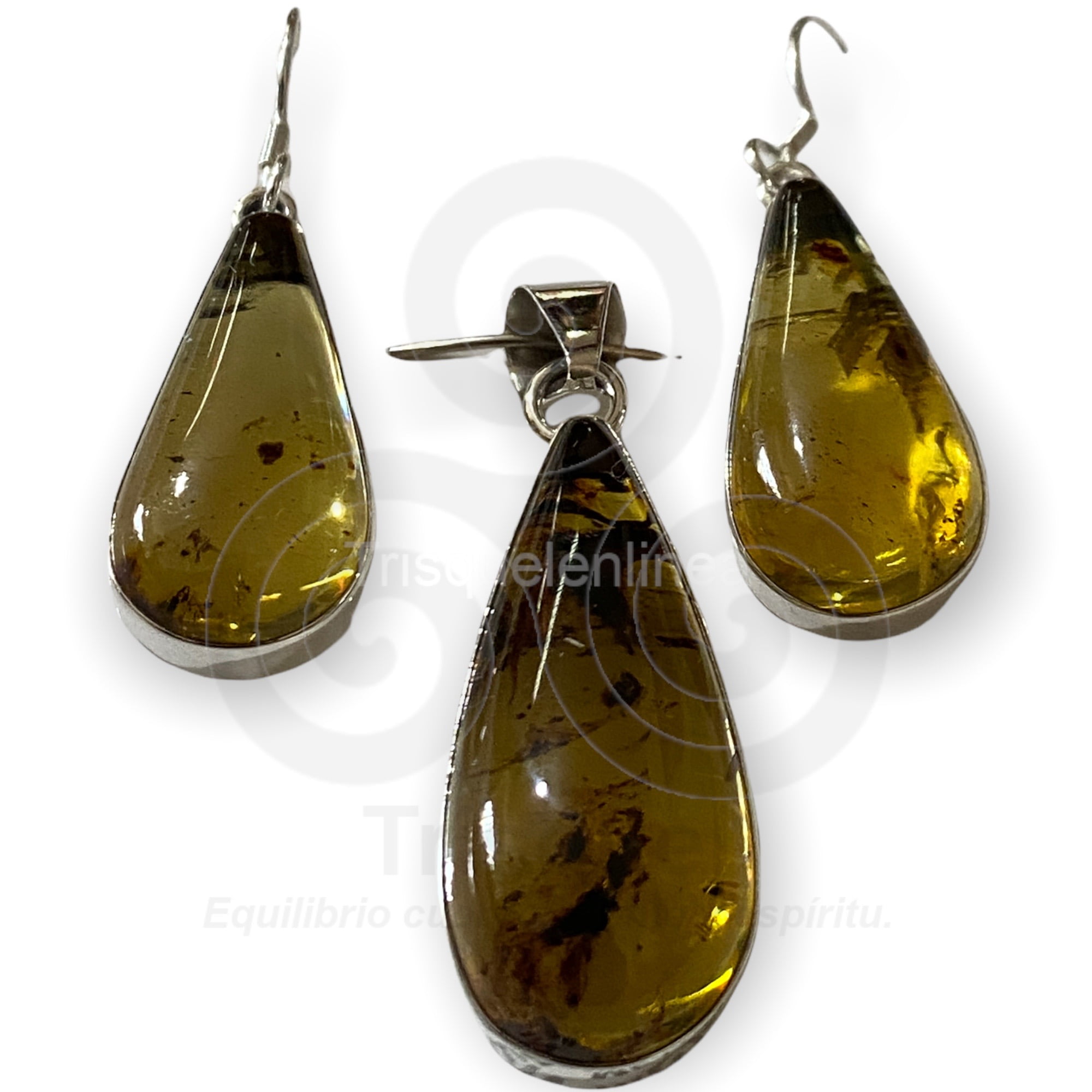 Hermosas piezas de ambar engarzadas en plata ley 925. El conjuto consta de: