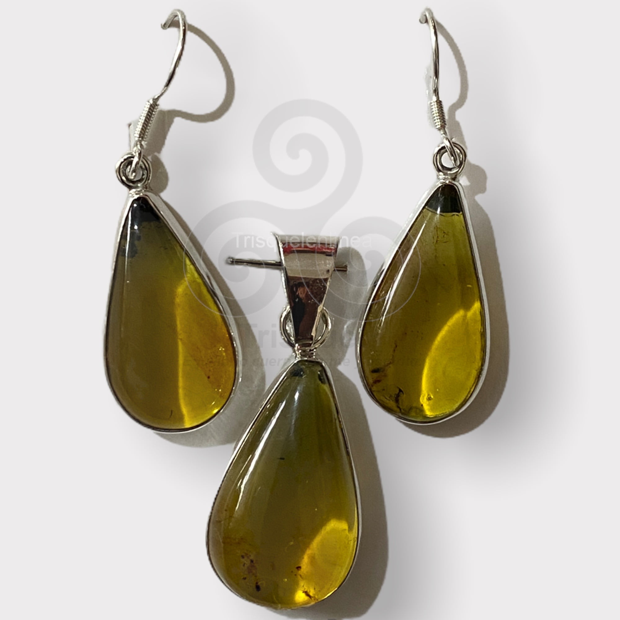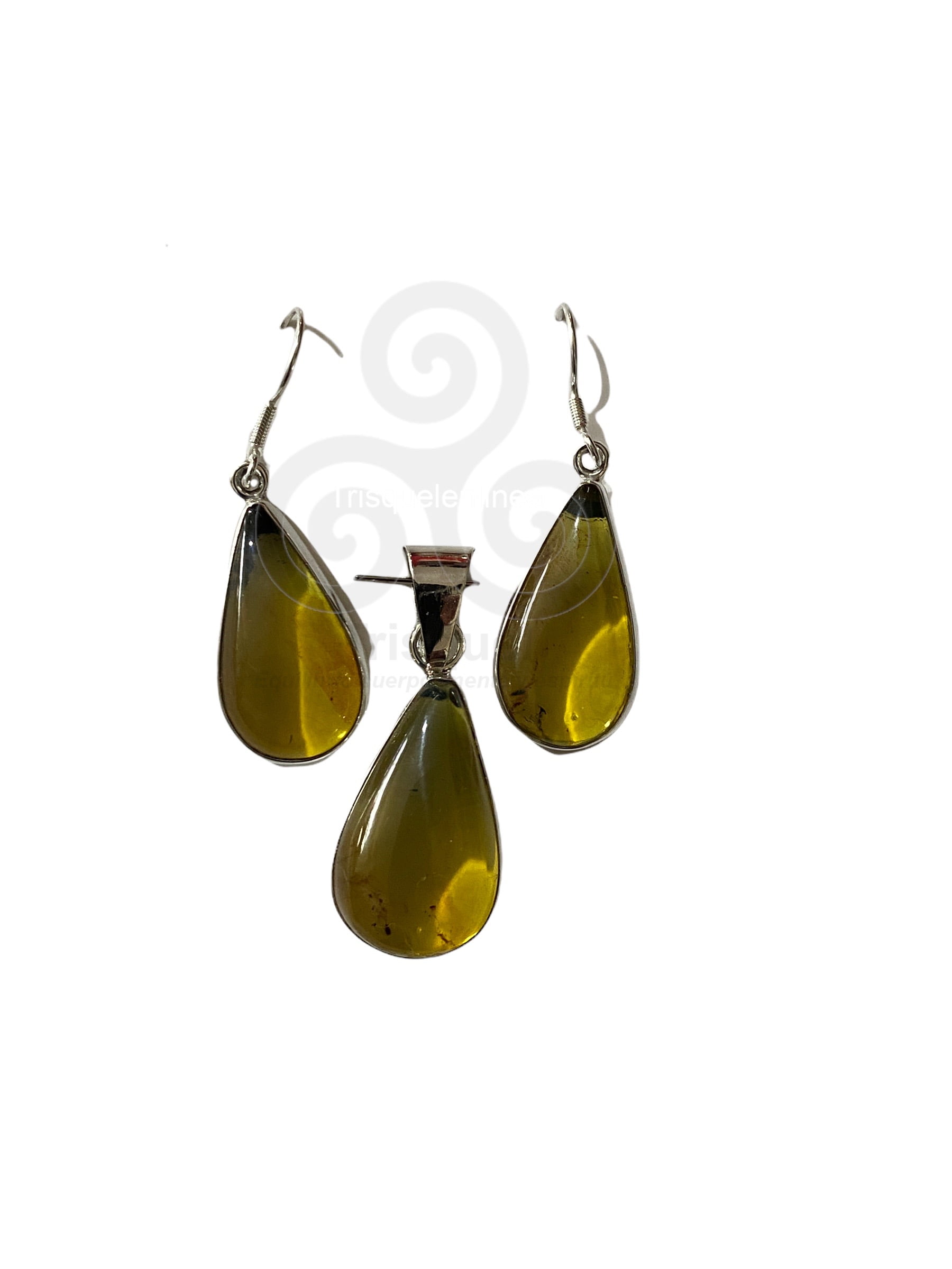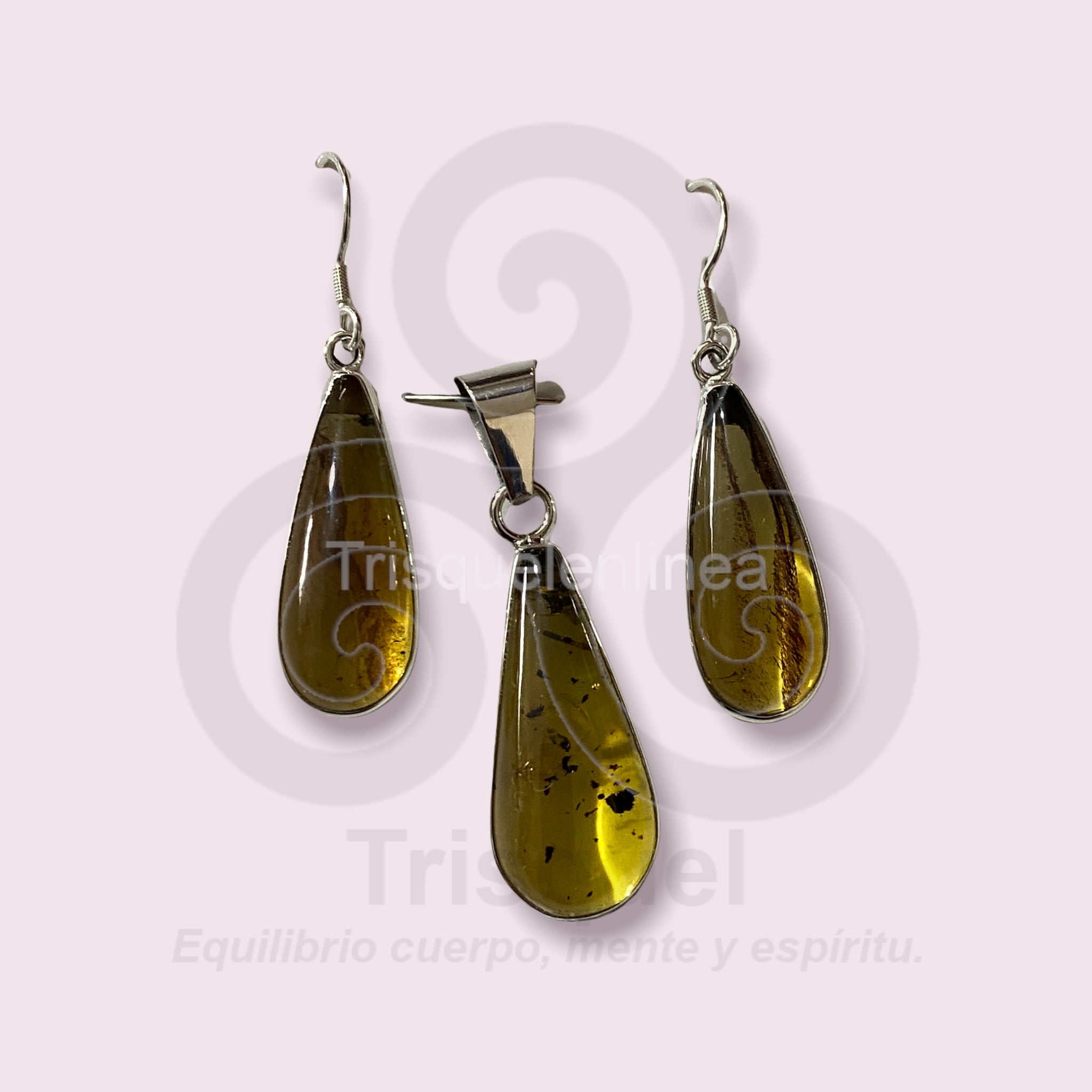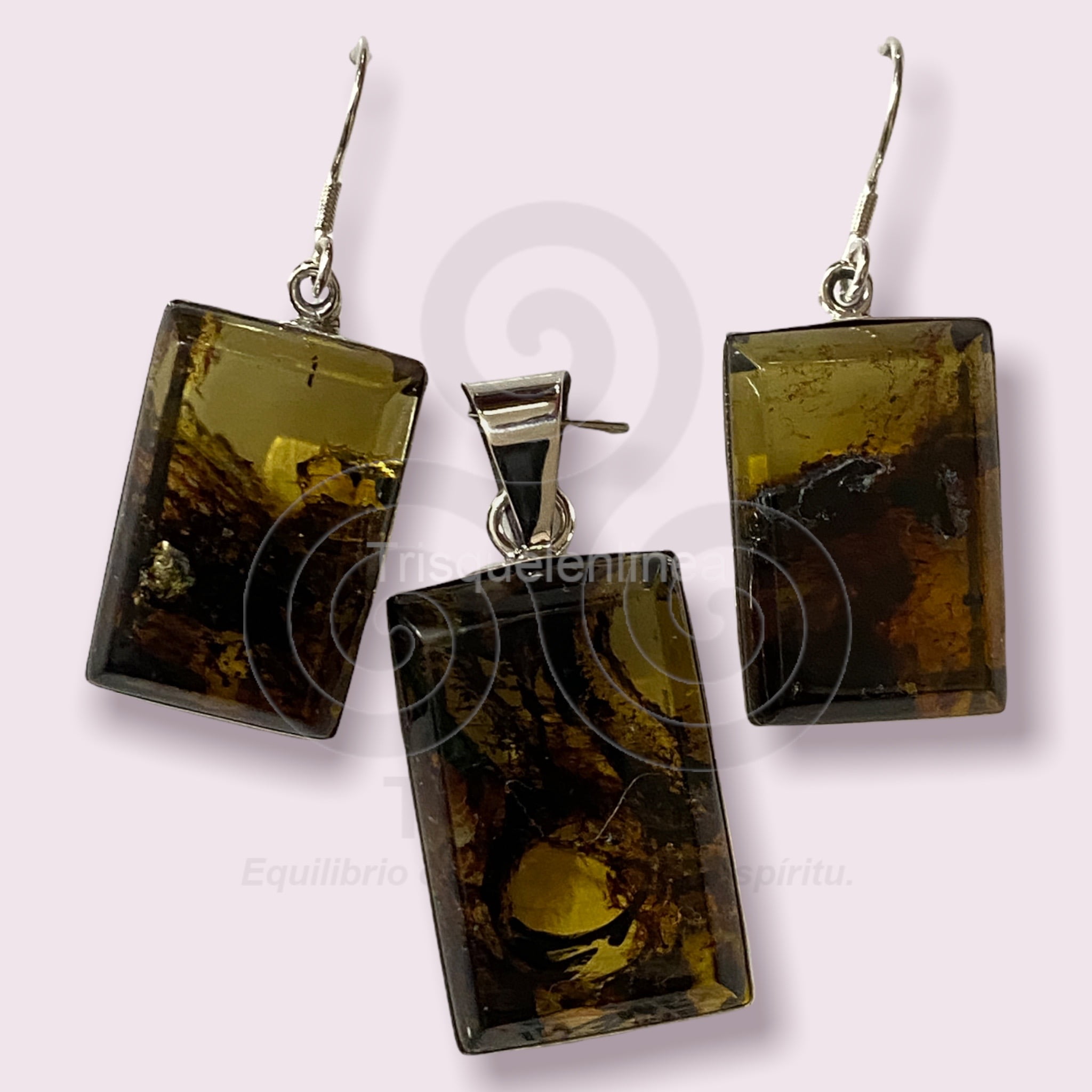 Hermosas piezas de ambar engarzadas en plata ley 925. El conjuto consta de: