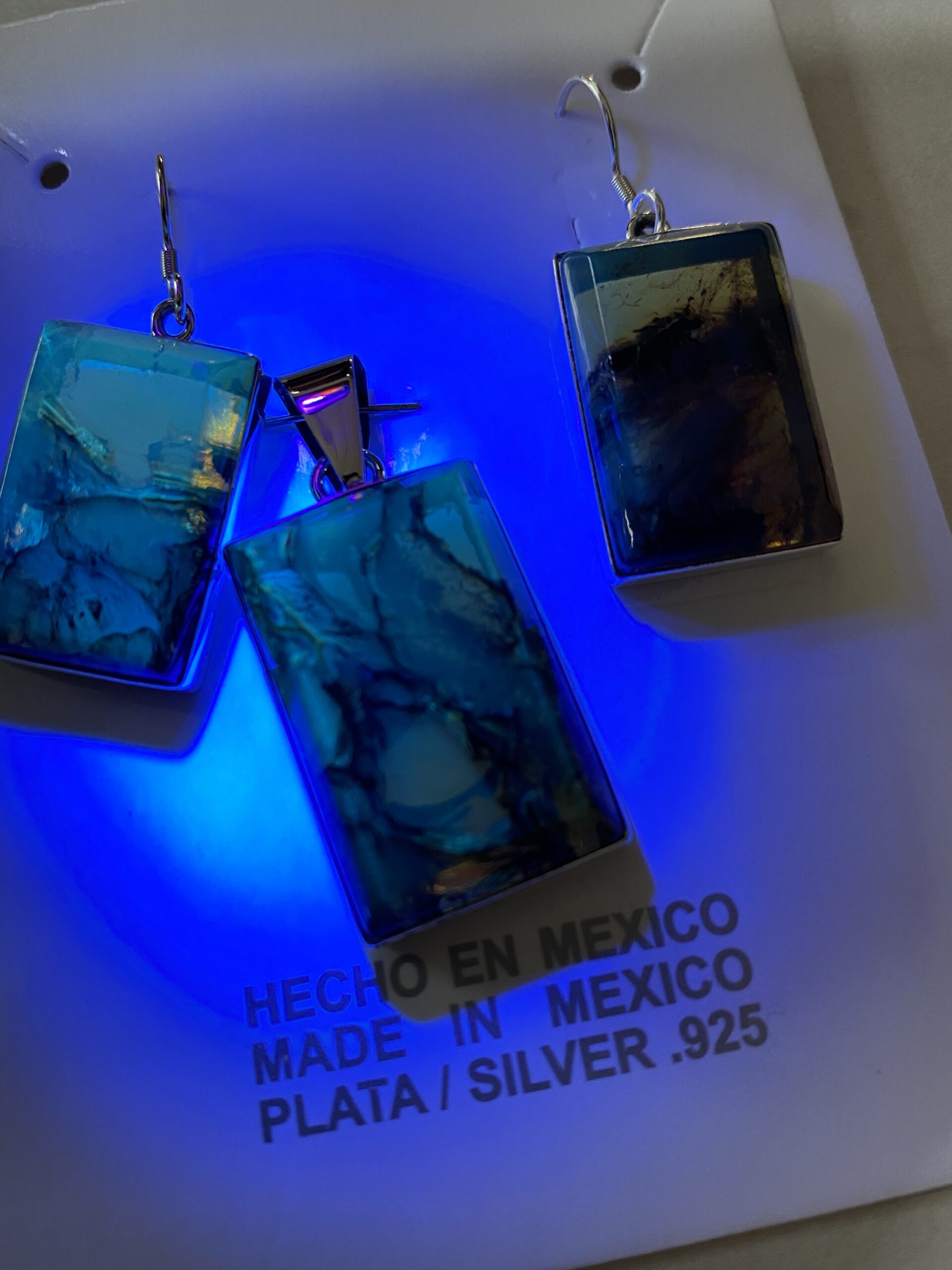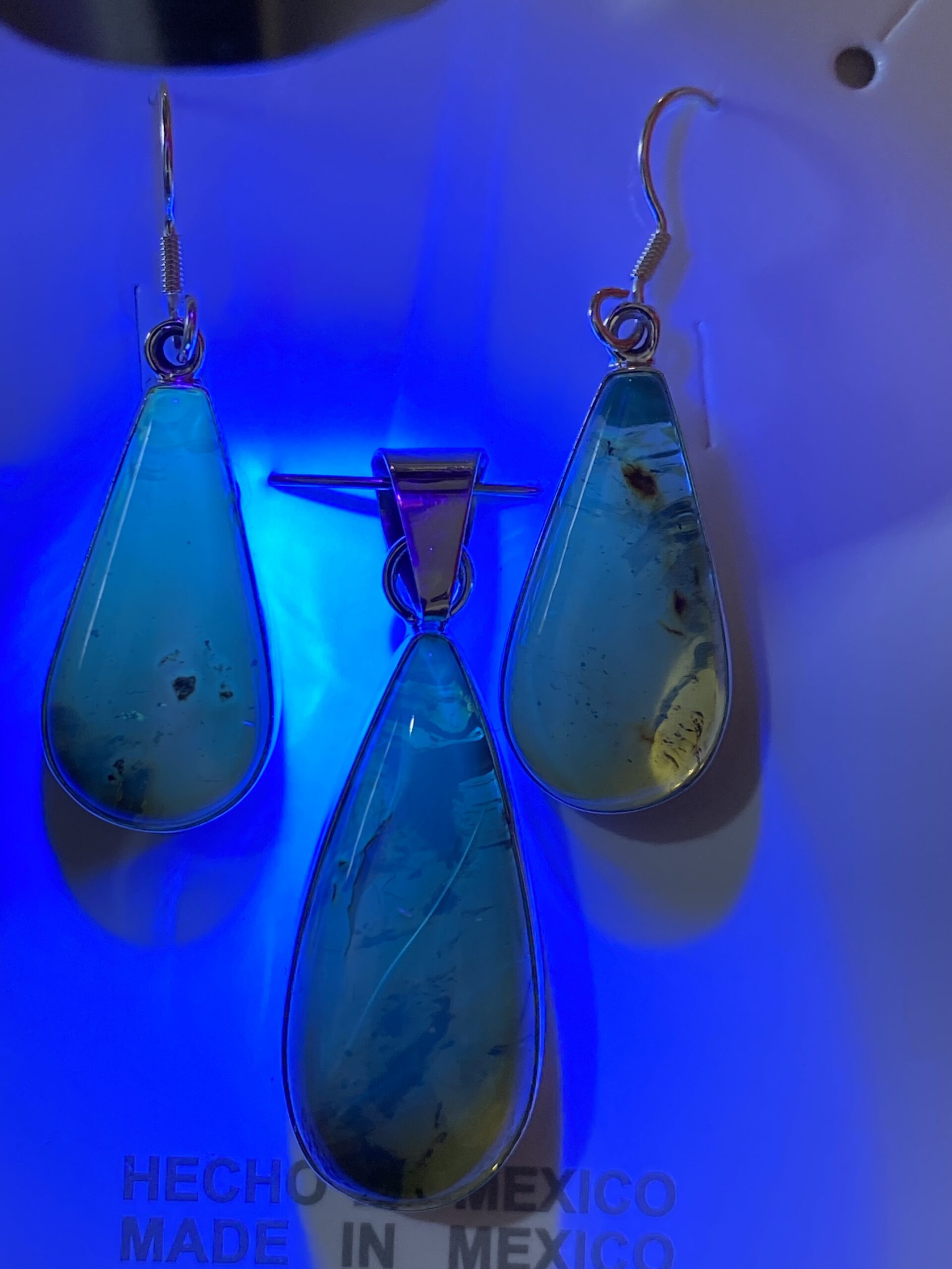 En las fotografias se podra obaservar el uso de luz ultravioleta para comprobar la autenticidad de las piezas, si se tratase de una imitación ya sea platico o vidrio la pieza no tendría ninguna reacción a la luz Uv. Esta prueba nos ayuda a identificar y descartar los simulantes de ámbar, de los auténticos, sin dañar nuestros ejemplares.